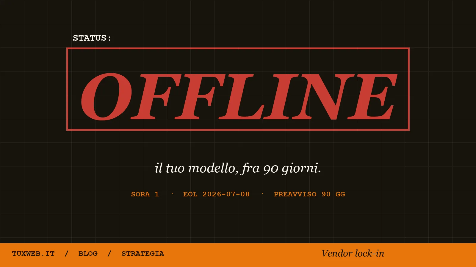 Sora 1 dismissed by July 2026 è un campanello. Suonerà ancora, e per modelli più centrali. La domanda da farsi adesso non è "cosa fare quando succede al mio business case", è "cosa farò il giorno in cui succederà al modello che ho integrato nel prodotto". Se non hai una risposta in mezz'ora, hai un problema.